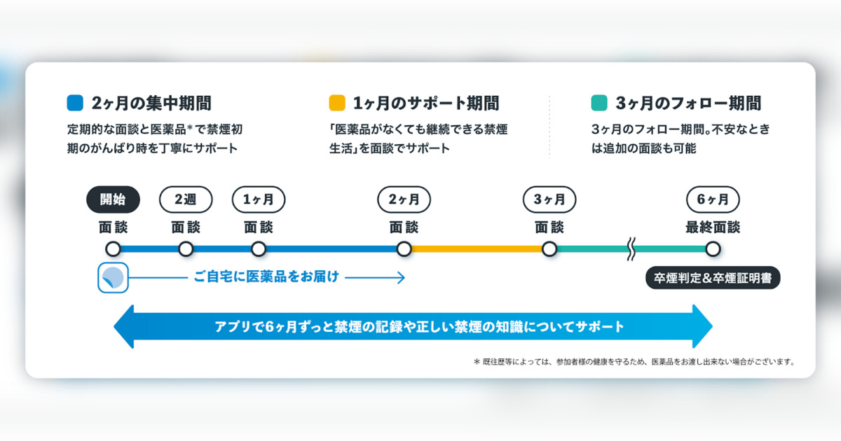 当プログラムは、看護師や薬剤師などの医療資格を持ち、さらに育成プログラムを経て専門知識を持った指導員が丁寧にオンライン面談を行います。加えて専用のアプリからも365日参加者個人に合わせたアドバイスを提供し、薬では対処しにくい心理面においても手厚いサポートが可能となります。また、禁煙の失敗(再喫煙)が多いとされる3〜6ヶ月の期間を長期的に支援することにより、プログラム終了後における禁煙継続にも寄与します。