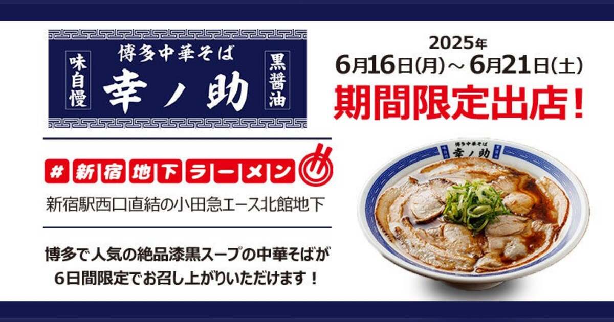 世界12カ国90店舗以上を展開、ラーメンのグローバルブランド、博多⼀幸舎や幸ちゃんラーメンを運営する、株式会社ウインズジャパンホールディングス(所在地 福岡県福岡市博多区、代表取締役社⻑ 吉村 幸助 以下当社)は、2025年6月16日(月)より、新宿駅西口地下街の小田急エース北館にて小田急百貨店がプロデュースする食品売場「SHINJUKU DELISH PARK」内、全国の有名ラーメン店が期間限定で出店するPOP UPスペース「#新宿地下ラーメン」にて、絶品漆黒スープが自慢の「博多中華そば幸ノ助」を6日間の期間限定で販売いたします。この機会に是非お召し上がりください!