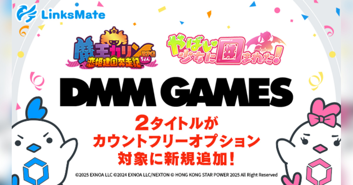 株式会社LogicLinks(以下LogicLinks、本社:東京都渋谷区、代表取締役社長:春田康一)は、MVNOサービス「LinksMate」において2025年6月12日(木)よりカウントフリーオプション対象コンテンツとして合同会社EXNOA(本社:東京都港区、CEO:村中 悠介)が提供するオンラインゲームプラットフォーム『DMM GAMES』にて配信中の「魔王カリンちゃんRPG 〜恋姫建国奔走記〜」、「やばい!少女に囲まれた!」を新たに追加することをお知らせいたします。