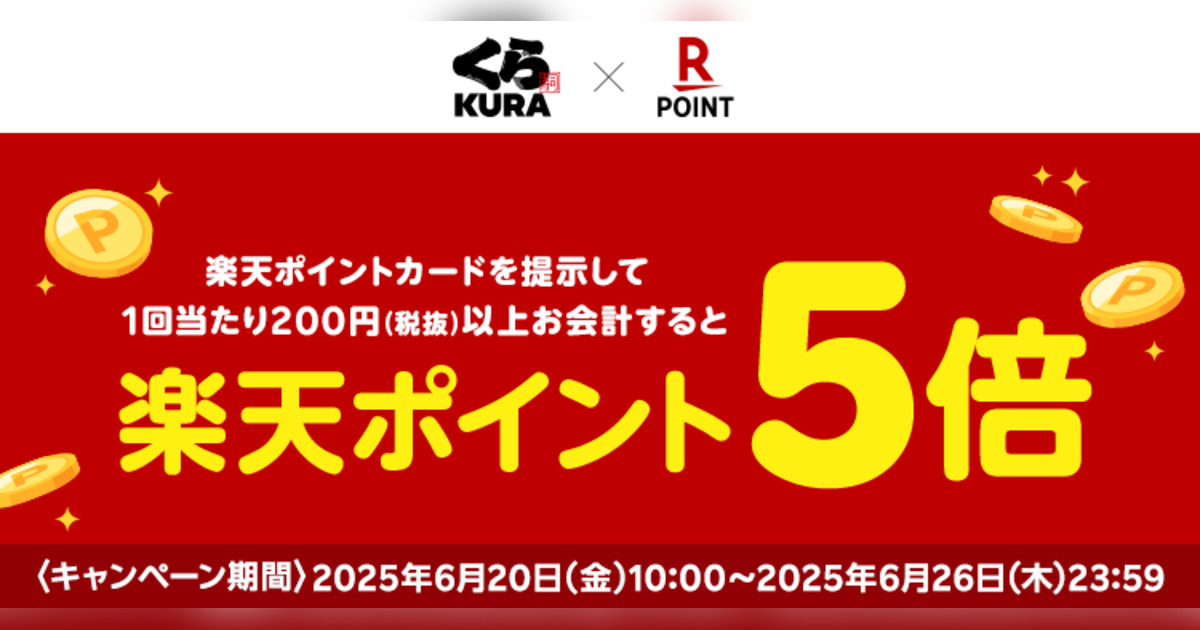 楽天ペイメント株式会社(以下「楽天ペイメント」)は、共通ポイントサービス「楽天ポイントカード」において、くら寿司株式会社(以下「くら寿司」)と共同で「くら寿司 楽天ポイント5倍キャンペーン」を、2025年6月20日(金)から6月26日(木)まで実施します。