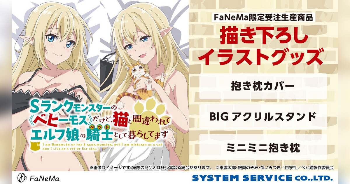 システムサービス株式会社(本社:東京都豊島区、代表取締役社長:田村宗弘)は、アニメ・マンガ・ゲーム作品等のキャラクター商品の企画・製作・販売をする自社ECサイト「FaNeMa」(URL:https://fanema.jp/)にて、『Sランクモンスターの《ベヒーモス》だけど、猫と間違われてエルフ娘の騎士として暮らしてます』より「抱き枕カバー」「ミニミニ抱き枕」「BIGアクリルスタンド」を発売いたします。さらに、新商品発売を記念したX(旧Twitter)フォロー&リポストキャンペーンも実施いたします。