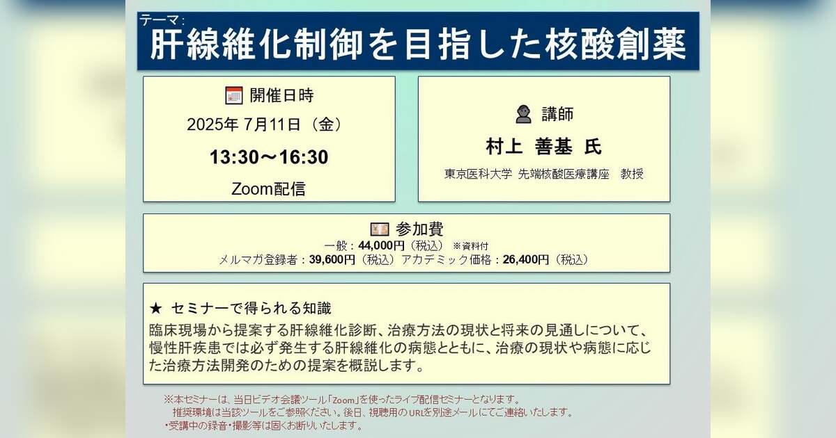 先端技術情報や市場情報を提供している(株)シーエムシー・リサーチ(千代田区神田錦町: https://cmcre.com/ )では、 各種材料・化学品などの市場動向・技術動向のセミナーや書籍発行を行っておりますが、 このたび「肝線維化制御を目指した核酸創薬」と題するセミナーを、 講師に村上 善基 氏 (東京医科大学 先端核酸医療講座 教授)をお迎えし、2025年7月11日(金)13:30より、 ZOOMを利用したライブ配信で開催いたします。 受講料は、 一般:44,000円(税込)、 弊社メルマガ会員:39,600円(税込)、 アカデミック価格は26,400円(税込)となっております(資料付)。
