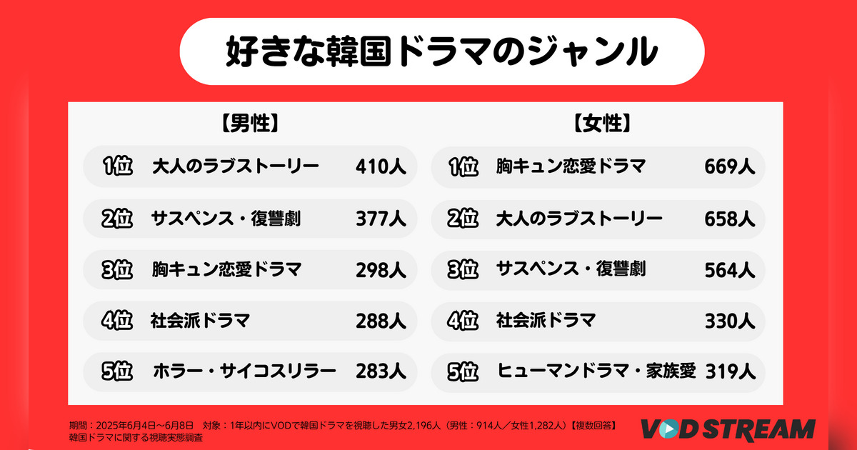 ナイル株式会社(本社:東京都品川区、 代表取締役社長:高橋飛翔、 以下ナイル)が運営するエンタメ情報メディア「VOD STREAM」にて、15~59歳の男女9,617人を対象に、2025年6月4日~6月8日の期間、韓国ドラマに関する視聴実態調査を実施しました。