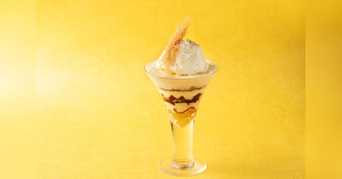 パフェの上部には、クレミアソフトクリームにとうもろこしピューレを合わせた冷製コーンスープのような味わいのとうもろこしソフトと、三重県産九華(くわな)のはちみつでマリネしたとうもろこしを重ね、続くキャラメルソースやブリュレクリーム、生クリームの層がとうもろこしの優しい甘さを引き立てます。パフェのトップには、パイナップルエスプーマや生クリーム、とうもろこしをイメージしたカダイフ飾り、香ばしい食感が楽しめるくるみキャラメリゼを合わせ、味のアクセントに黒コショウを散りばめました。