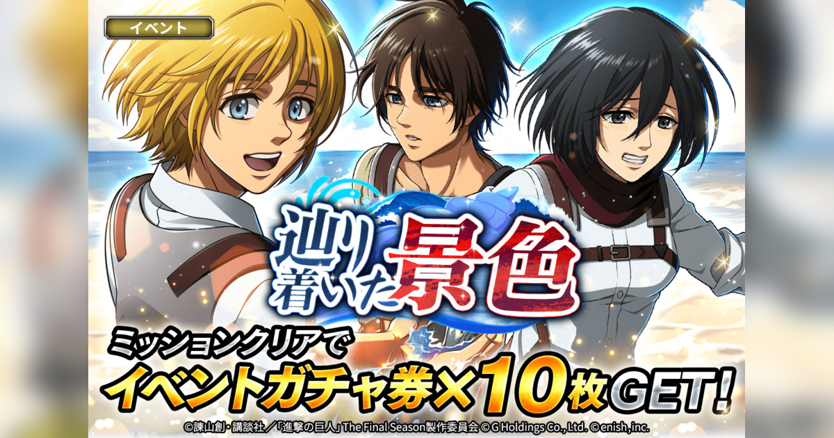 株式会社enish(本社:東京都港区、代表取締役社長:安徳 孝平、以下enish)は、アニメ『進撃の巨人』のスマートフォンゲーム最新作「進撃の巨人Brave Order」にて、2025年6月13日(金)より、「辿り着いた景色」を開催!また、本日より新登場の【辿り着いた景色】アルミン・アルレルト、【辿り着いた景色】ミカサ・アッカーマン、【辿り着いた景色】エレン・イェーガーがピックアップされた「辿り着いた景色ガチャ」も開催!その他、最新情報はゲーム公式サイト・ゲーム公式X(旧Twitter)アカウントにて随時公開して行きますので、ぜひご覧ください。