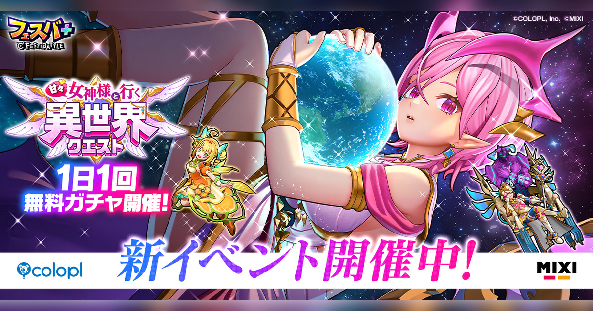 株式会社コロプラ(代表取締役社長 上席執行役員 CEO:宮本貴志、本社:東京都港区、以下「コロプラ」)は、株式会社MIXI(代表取締役社長 上級執行役員 CEO:木村弘毅、本社:東京都渋谷区、以下「MIXI」)と共に取り組んでいるスマートフォン&PC向けゲーム『フェスバ+』について、新イベント「甘々 女神様と行く異世界クエスト」を2025年6月13日(金)より開始したことをお知らせいたします。