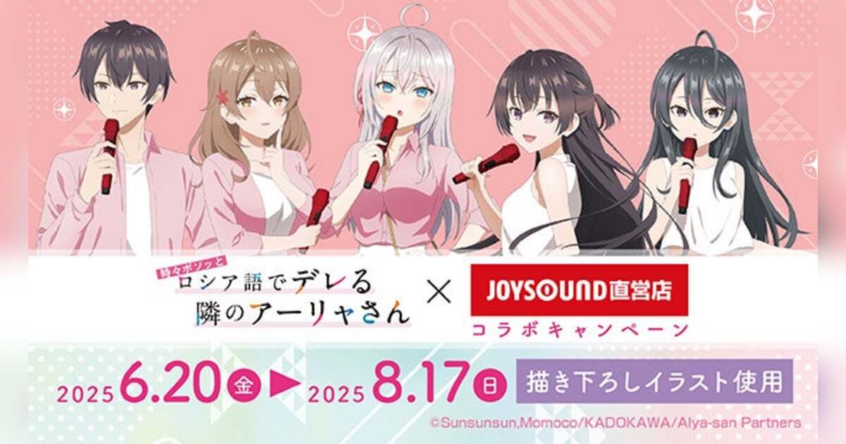 株式会社エクシングの子会社で、全国にカラオケ店舗・ネットカフェ店舗を展開する株式会社スタンダード(本社:東京都港区、代表取締役社長:小林克章)は、2025年6月20日(金)から2025年8月17日(日)までの期間中、「TVアニメ『時々ボソッとロシア語でデレる隣のアーリャさん』×JOYSOUND直営店コラボキャンペーン」と題し、JOYSOUND渋谷道玄坂店(東京)・JOYSOUND天王寺アポロ店(大阪)の2店舗にカラオケコラボルームをオープン!また、JOYSOUND直営店30店舗にて、オリジナルノベルティ付きコラボドリンクを展開します。さらに、一部店舗およびオンラインストアにて、オリジナルグッズの販売も行います。当コラボでは、ピンクと白のオリジナル衣装を着た描き下ろしイラストを使用いたします!