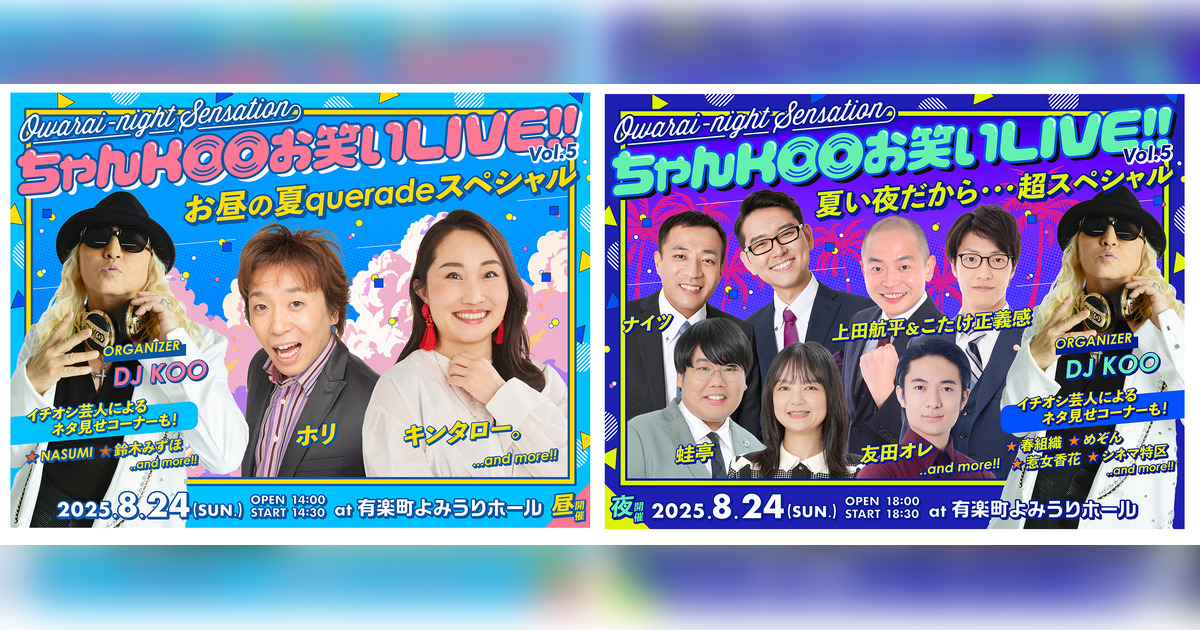 2025年8月24日(日)、DJ KOOのお笑いイベント「Owarai-night Sensation『DJ KOO presents ちゃんKOOお笑いLIVE!! vol.5』~お昼の夏queradeスペシャル~」「Owarai-night Sensation『DJ KOO presents ちゃんKOOお笑いLIVE!! vol.5』~夏い夜だから・・・超スペシャル~」を、東京・有楽町よみうりホールにて開催することが決定しました。