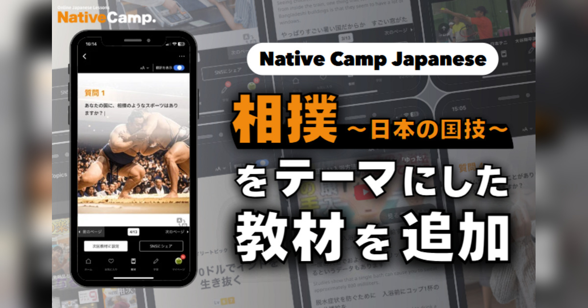 株式会社ネイティブキャンプ(本社:東京都渋谷区、代表取締役社長:谷川国洋)が提供するオンライン日本語会話サービス『Native Camp Japanese』では、このたび、このたび、人気教材「デイリートピック」に”相撲”をテーマにした教材を追加しました。