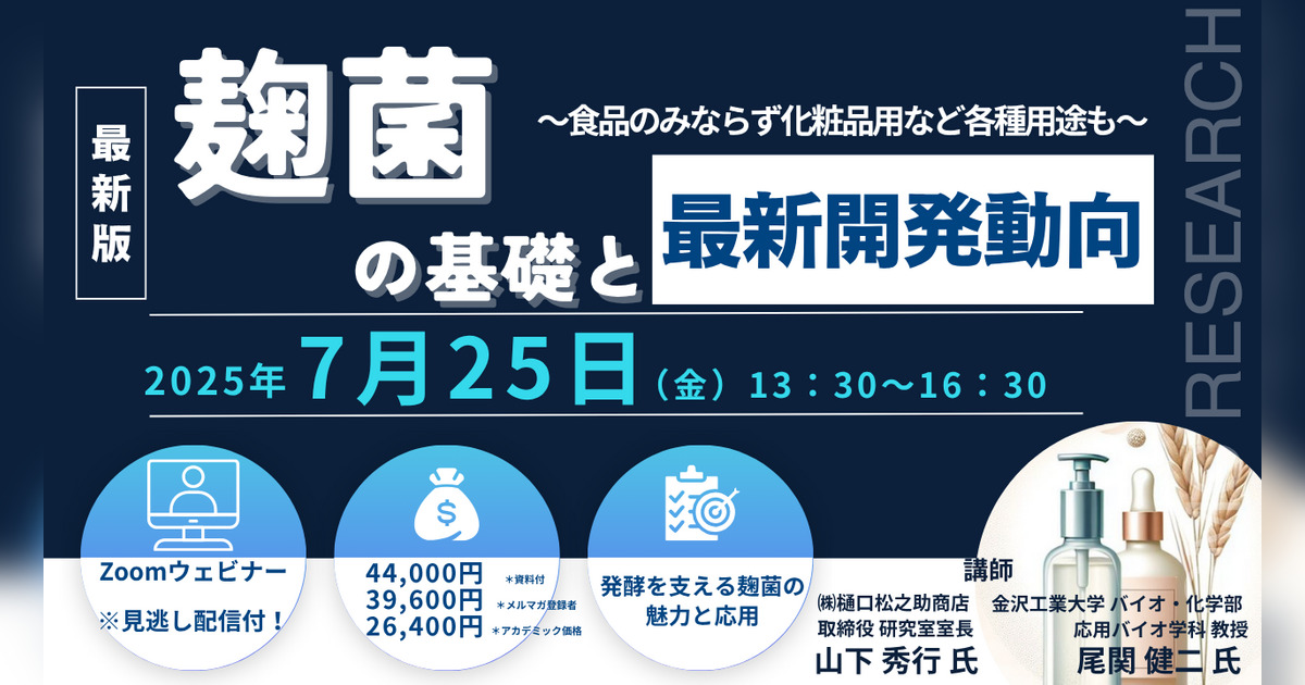 経済 【ライブ配信セミナー】麹菌の基礎と最新開発動向 ~食品のみならず化粧品用など各種用途も~ 7月25日(金)開催 主催:(株)シーエムシー・リサーチ boingo 6月 20, 2025 コメントはまだありません ‘ 先端技術情報や...